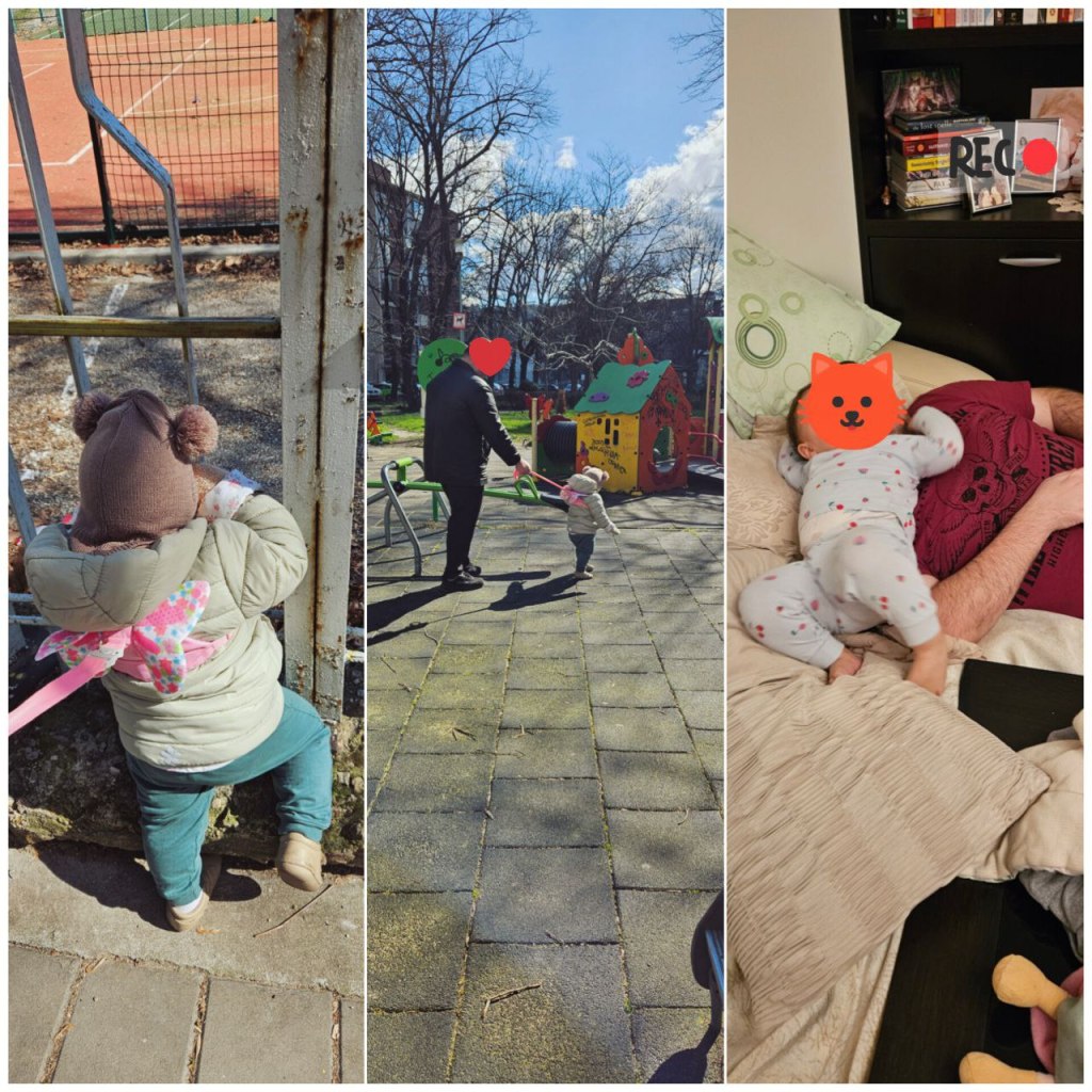 From left to right: she was watching the kids play at the school playground near the park we visit and some kids came and said hello to her. She was so happy. In the middle pic, my husband is walking her while I was at the butcher’s shop, and I took a sneaky picture of them. The last one, she learned how to climb on the sofa, and before bed, she climbed and went to snuggle with her dad. They had a cute father-daughter bonding moment 🙂